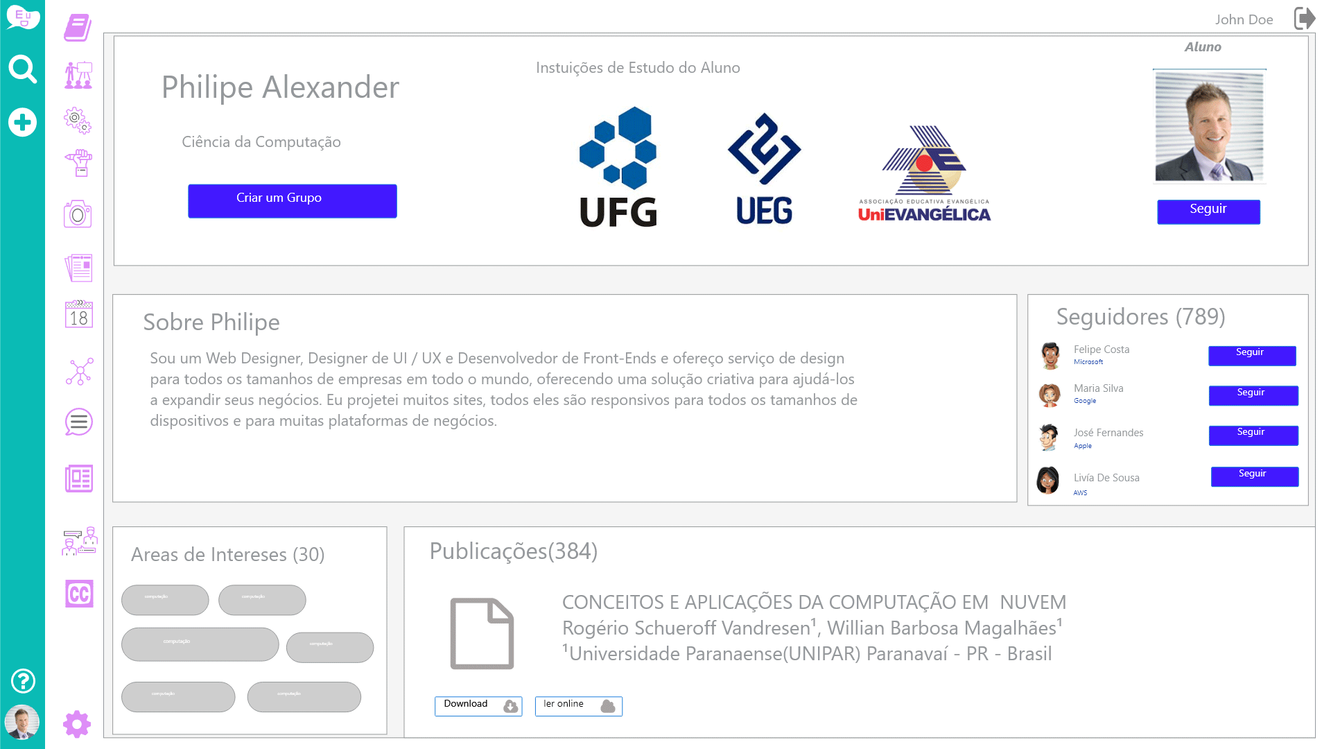 onde é possível encontrar qualquer usuário cadastrado no aplicativo dentro de sua instituição e usuários de outras IES. É disponibilizado como ferramentas de busca e filtro como privado que é dentro da instituição e público que pode ser em perfis de outras instituições cadastradas onde o usuário permitiu que o perfil fosse público (pesquisa por nome; filtro por curso, filtro por período; e tipo de usuário: discente, docente, empresa, atlética ou centro acadêmico),quando o usuário é encontrado por essa ferramenta ou por meio da navegação no perfil podem ser vistas todas as informações públicas do usuário, bem como curtir o mesmo, seguir seus feeds públicos.