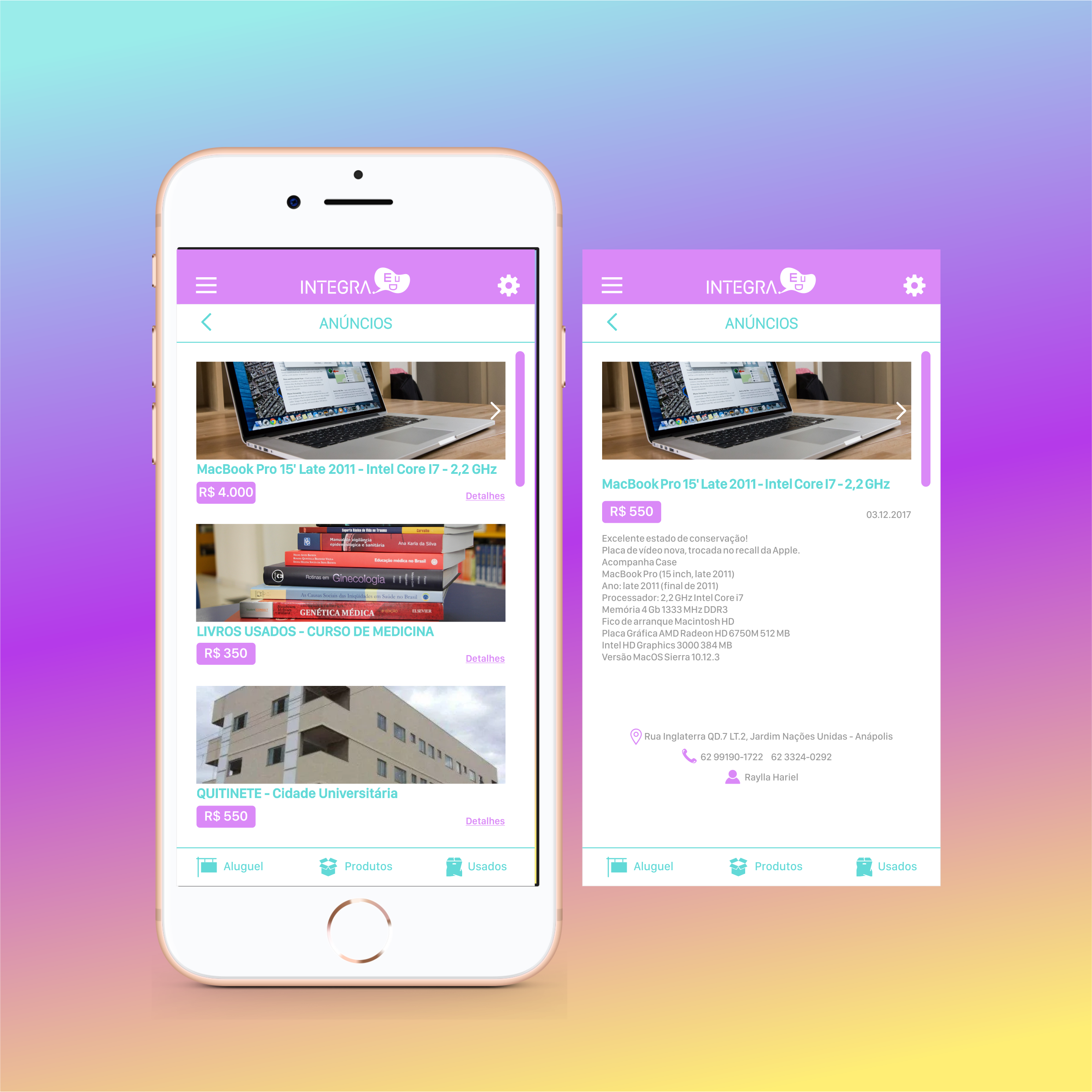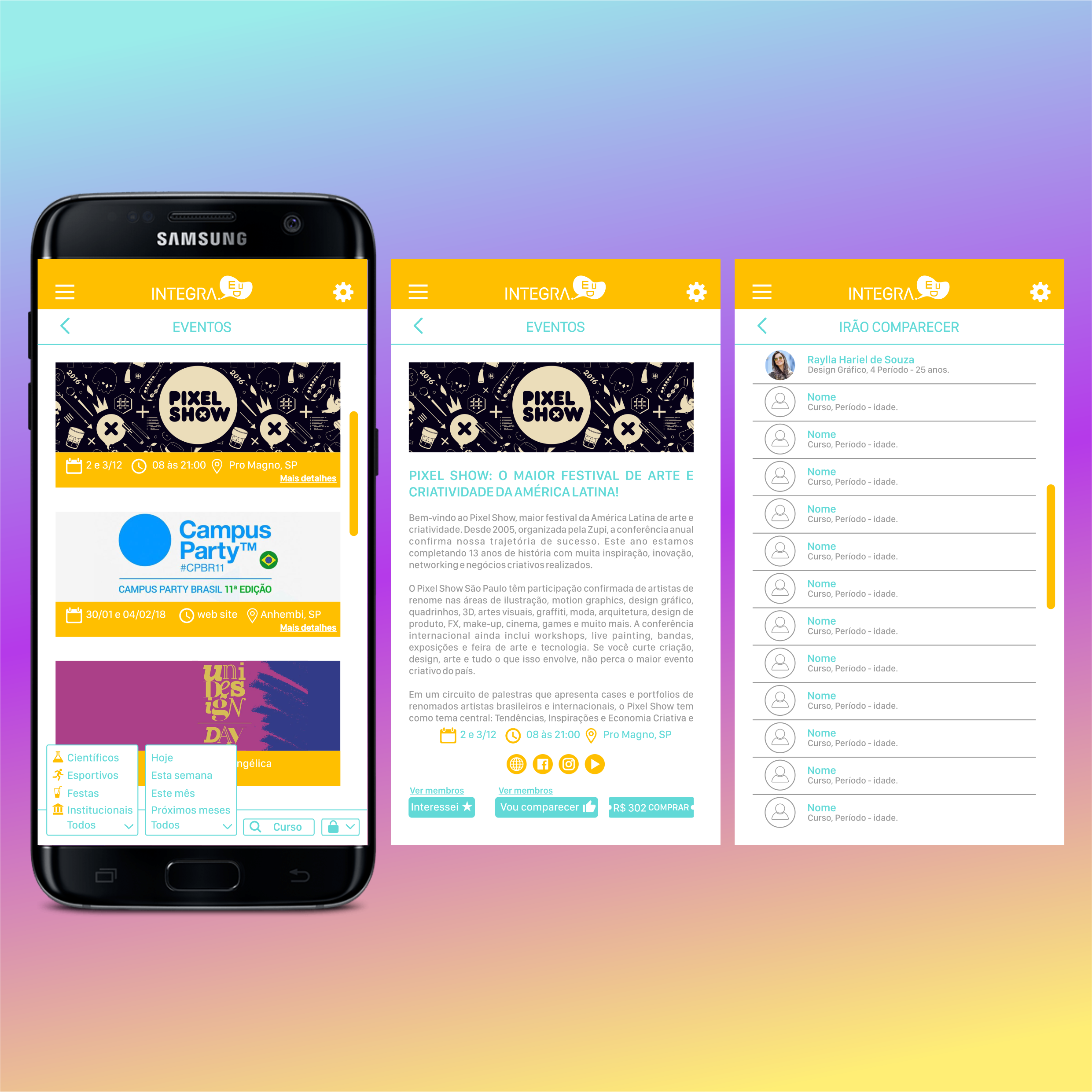 Um painel com eventos de cunho (científico, esportivo, festas e institucionais), onde o usuário pode pesquisar por texto ou mesmo filtrar o tipo de evento que quer ver por áreas afins (graduação) e ainda visualizar os eventos quanto aos filtros (hoje; esta semana; este mês e próximos meses). Neste menu é mostrado todos os detalhes do evento (data, horário, local, valor caso seja pago, website). É contemplado ainda com outras funções como a opção de marcar que tem interesse ou que vai comparecer e ainda ver os membros que marcaram tal opção. Possui a opção de compra caso o evento tenha parceria com o sistema de bilheteria digital do aplicativo, o menu Bilheteria Integra que será tratado. Eventos podem ser criados e patrocinados com anúncios por qualquer usuário após avaliação e aprovação do mesmo pelo aplicativo antes da publicação. Além disso, na opção de filtro público ou privado o usuário pode visualizar eventos de sua instituição ou de outras instituições país afora.