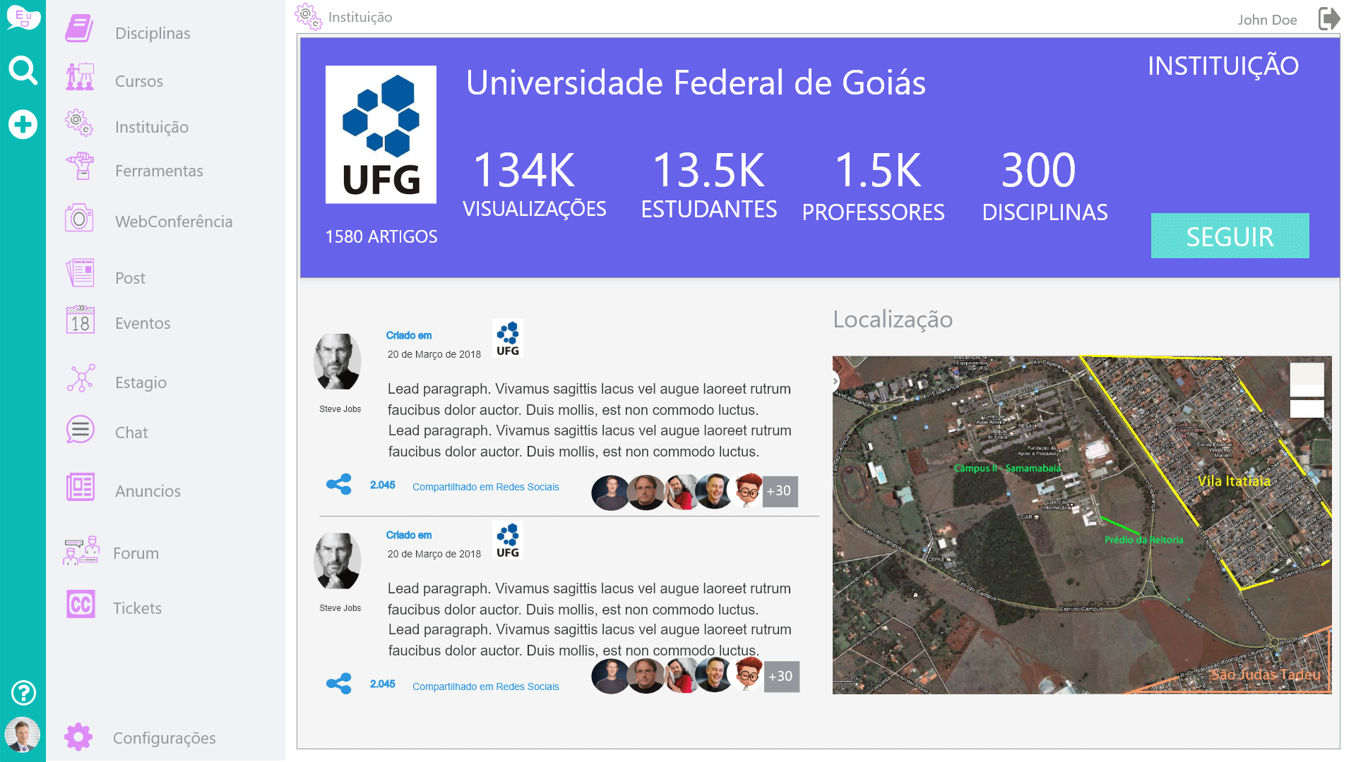 Terão um perfil social e acadêmico com as informações (Imagem da logo; CNPJ; Apresentação; breve história; Razão social; Nome fantasia; E-mail e telefones úteis; Localização da sede; Link de redes sociais: Facebook e Instagram).