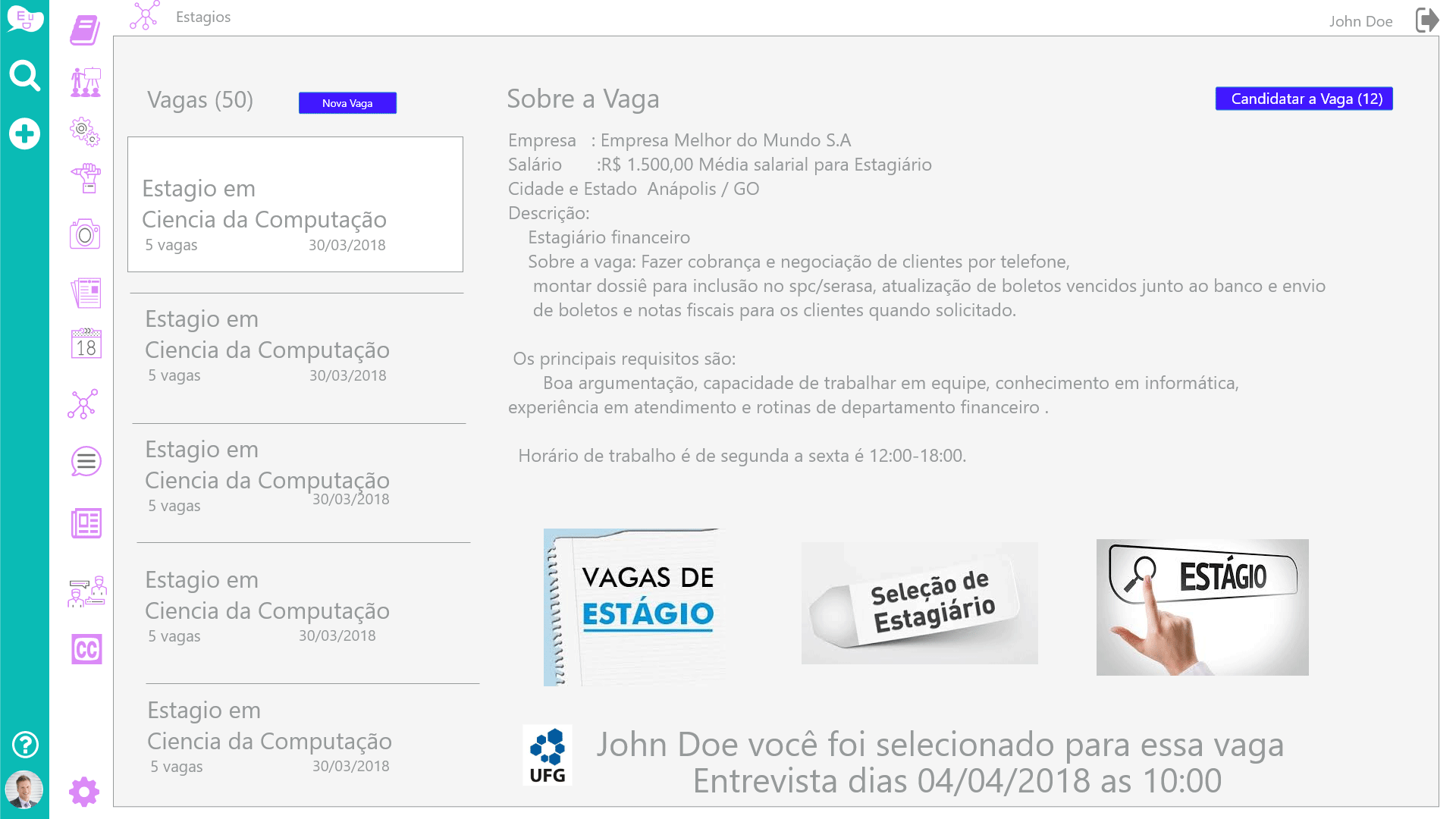 A outro principal vertente do aplicativo é disponibilizar um ambiente virtual que oferece mais praticidade, eficiência e oportunidades na contratação para estágios tanto para as empresas quanto para o acadêmico. Assim este menu terá um painel de notícias de vagas cadastradas pelas empresas, os requisitos básicos e informações para que o acadêmico tenha a oportunidade de concorrer à vaga, bem como, a empresa analisar em tempo real o currículo lattes do acadêmico e o seu perfil social e dessa forma, convocar o acadêmico para uma entrevista. Neste menu, os usuários cadastrados como empresa contratante sempre podem lançar vagas e apagar as mesmas quando preenchidas.