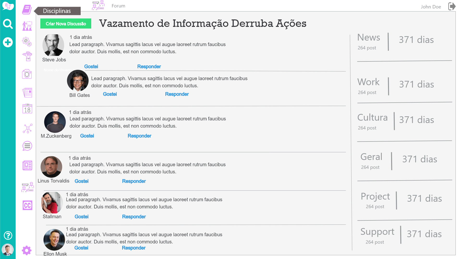 Concebido com o intuito de motivar o debate entre os usuários e os esclarecimentos de assunto, dentre as configurações será possível classificá-lo como ‘Público’ - aberto a todo usuário da ferramenta fórum ou ‘Privado’ - destinado aos usuários com acesso ao ambiente/sala que deu origem a abertura do mesmo. Serão utilizadas hashtags como filtro de discussões, pesquisa e classificações das mesmas assim como o Twitter.